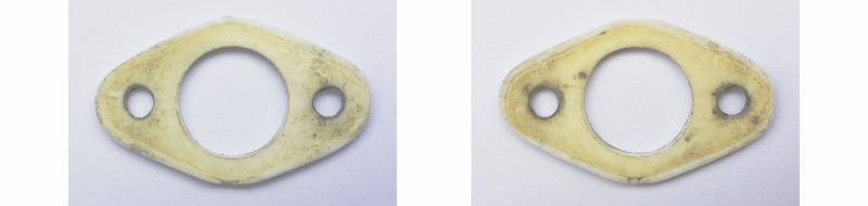 Cependant, avec le temps, et de très nombreux cycles chauffe/refroidissement, et par là dilatation/contraction, sous l'effet fluage, la matière du joint a tendance à migrer vers la périphérie, et par là, son épaisseur diminue. (Ce phénomène est visible sur les photos ci-dessus: les surfaces jaunies, amincies, étaient en contact avec la pipe ou la culasse; alors que le pourtour, encore blanc, est plus épais et plus large qu'il ne l'était au départ.)
